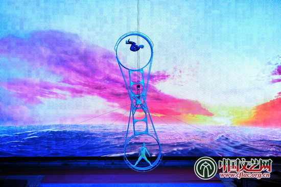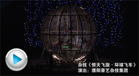“咿——呀——”第一个节目《俏花旦·集体空竹》先声夺人,11个俏丽的花旦轻盈上场,空竹抖起,抛向空中,翻身跳跃,再一侧身,将空竹稳稳接住,姿态优美,像燕子,像蝴蝶,又像精灵。这个节目将传统与时尚巧妙融合,曾在2007年央视春晚观众最喜爱的节目中获得一等奖,并获第37届摩纳哥蒙特卡罗国际马戏节“金小丑”奖、第26届法国国际杂技最高奖“法兰西共和国总统奖”等多项殊荣。火辣的探戈舞串场之后,一个庞大的滚动的轴轮出现在台上。只见背景屏幕中忽而海浪翻滚,阴云密布,忽而风平浪静,晚霞映天,一黑一白两人在海上巨轮中疾走跳跃,好似天与地、生与死不断轮回。《天地轮回·生死轮》是河南濮阳杂技剧《水秀》片段,《水秀》刚刚在第八届中国杂技金菊奖第三次剧目奖中获得优秀剧目奖。