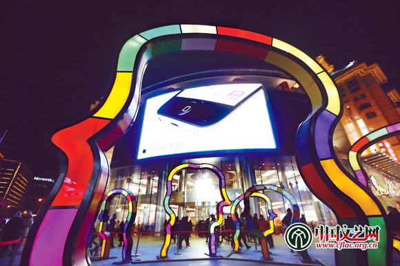 春节期间,在北京王府井,人头造型色彩斑斓的“遐想”雕塑吸引过往行人的目光。新华社 发