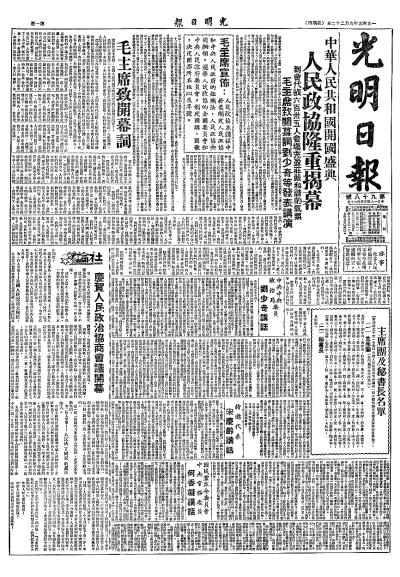 1949年9月21日,中国人民政治协商会议第一届全体会议举行。这是第二天出版的光明日报。 资料图片