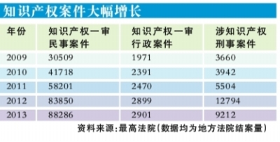 知识产权产业飞速发展,矛盾纠纷也成倍增长。最高法院数据显示,2009年至2013年,全国地方法院审结的知识产权一审民事案件从3万多件增长到近9万件;行政案件从近2000件增长到近3000件,刑事案件则从3000多件增长到9000多件。