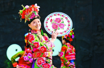 一名彝族演员在表演彝族舞蹈。 新华社发(胡超摄)
