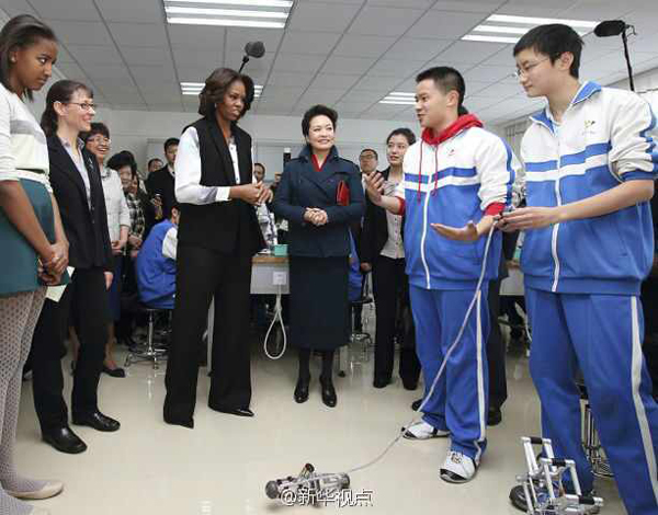在北师大二附中的几何机器人课上,学生们向彭丽媛和米歇尔介绍并演示自己设计制作的机器人。学生们流利的英文和独特的创意给客人留下了深刻印象。