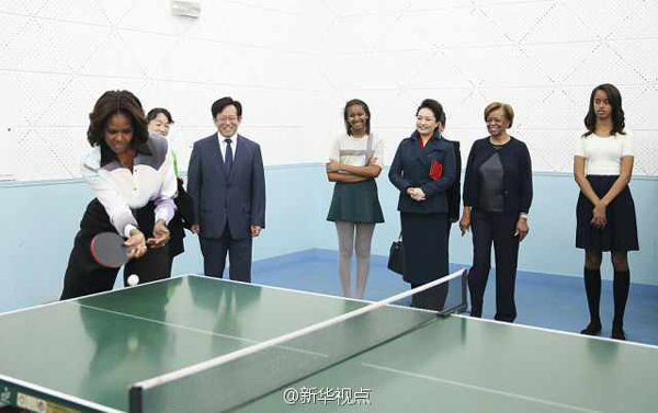 在北师大二附中的体育馆里,彭丽媛和米歇尔与学生们一起感受乒乓球运动的魅力。米歇尔与教练试着挥拍对打。彭丽媛提起40多年前的中美“乒乓外交”。