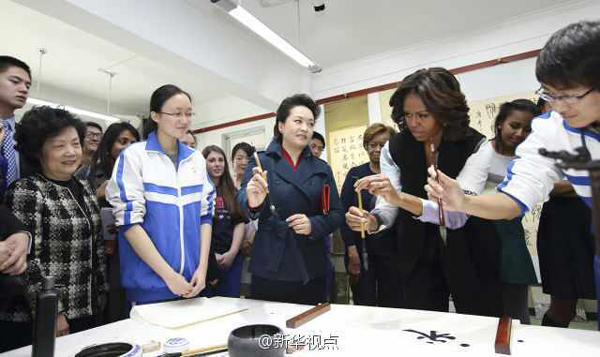 米歇尔和学生一起临摹汉字“永”,彭丽媛在旁拿起毛笔示范握笔。米歇尔连着写了两个“永”字,直夸中国书法太美了,说自己还要多练习。