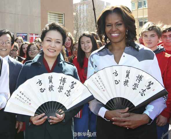 新华网北京3月21日电 据新华社“新华视点”微博报道,21日上午,习近平主席夫人彭丽媛与奥巴马总统夫人米歇尔一起来到北师大二附中参观。教学楼前,学生们手挥两国国旗,热情欢迎两国元首夫人。