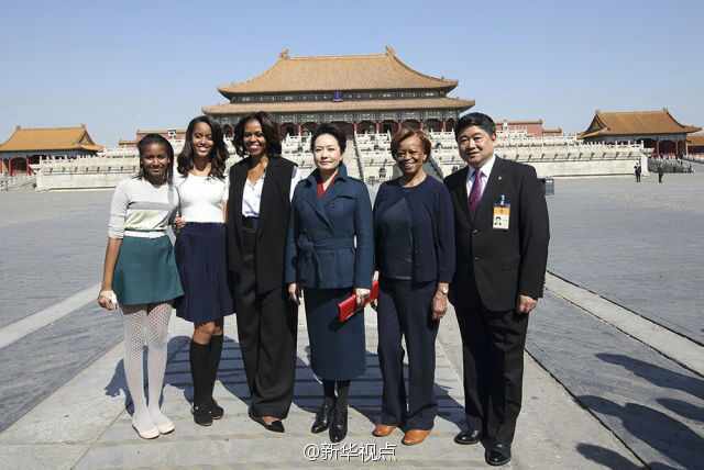 仲春时节的北京,阳光明媚,春意盎然,故宫的红墙黄瓦在湛蓝的天空下格外明艳。在太和殿前,彭丽媛同米歇尔及家人合影。
