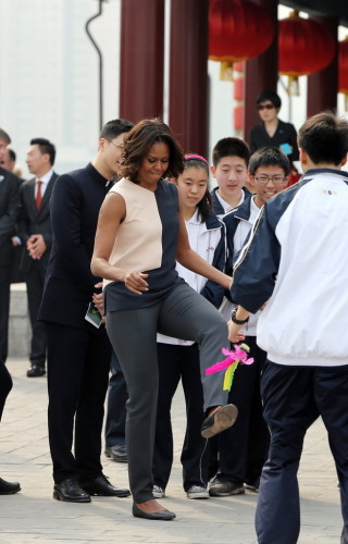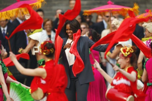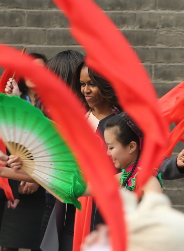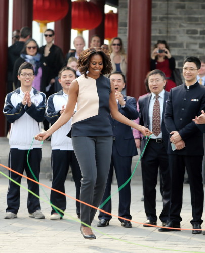 美国第一夫人米歇尔在西安城墙跳绳扭秧歌