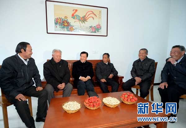 3月25日,刘云山在滁州市凤阳县小岗村村民家中,与大包干带头人、村干部和村民代表一起回顾从大包干到全国推行农村家庭联产承包责任制的历程,并就开展第二批党的群众路线教育实践活动进行交流。新华社记者 李涛 摄