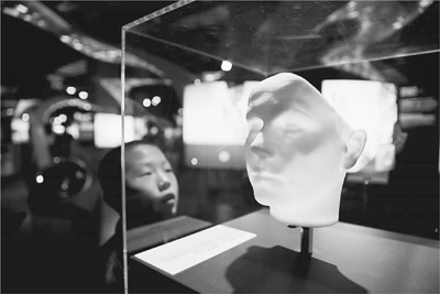在展览上,一个小孩被展示视觉幻觉的空心面具吸引。新华社记者 金立旺摄