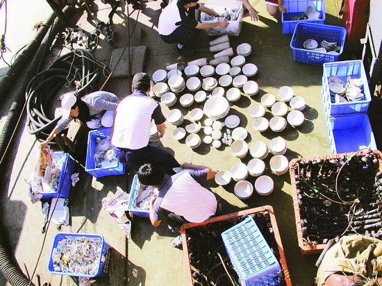 南宋初期,一艘通过海上丝绸之路向外运送瓷器的木质船失事沉没于广东省阳江市南海海域,被命名为“南海一号”。一九八七年,“南海一号”被发现,但因技术及资金问题而延迟研究。二○○七年十二月二十一日,“南海一号”古沉船起吊。二○一一年四月,“南海一号”完成第二次试发掘。“南海一号”的发掘与研究将为复原海上丝绸之路的历史、中国陶瓷史提供极为宝贵的实物资料,甚至可以获得文献和陆上考古无法提供的信息。图为考古队员正在对“南海一号”沉船出水的瓷器等文物进行分类。