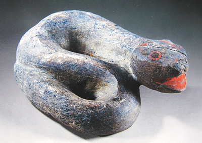蛇,在中国古代也被视为丰收或子孙繁衍的象征物,特别是在西南或南方地区的古代文化中,常见以蛇为母题的文物。年代最早的是相当于商代晚期古蜀人遗址出土的圆雕石蛇,在四川省成都金沙遗址至少发现过4件,石蛇头三角形,圆目张口,口唇涂成朱红色,身躯呈“S”形蟠曲,被认为是用于祭祀或与原始宗教有关的道具。南方地区的青铜器,也常饰有蛇纹,例如广西恭城出土的春秋时期的青铜尊上就有生动的双蛇斗蛙连续图案。稍迟一些生活在西南的古代民族更常以蛇为丰收或大地的象征物,例如云南省晋宁石寨山、江川李家山等地发掘的古代滇人的墓葬中,经常出土以蛇造型的文物。有以蛇头作銎的青铜铲,也有以蛇体作柄的青铜剑,柄首是张口的蛇头,形态极为生动。至于大量出土的以鸟兽人物为题材的青铜扣饰上,更是多饰有纠缠蟠曲的长蛇。一些表现祭祀、祈年等场景的青铜储贝器盖上的立体群雕中,也少不了蛇的身影。特别是在一座滇王的坟墓中,出土了西汉中央颁赐的黄金印,印文为“滇王之印”,印上的印纽也铸成一条蟠曲的金蛇,成为滇王高贵身份和权威的象征。