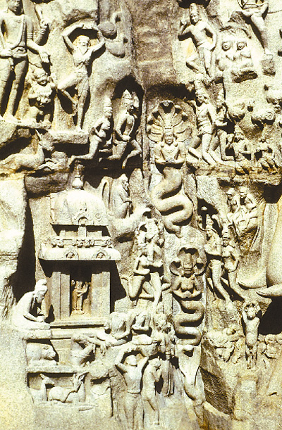 印度的蛇神通称那伽(蛇),汉译佛经误译为“龙”,那伽也被列为护佛的“天龙八部”之一。在古代印度佛教和印度教雕刻中,那伽的形象通常都是人首蛇身,头上有5个或7个眼镜蛇头兜,状如光环或华盖。南印度马哈巴利普拉姆的巨岩浮雕《恒河降凡》(约公元670年)在代表恒河的瀑布中畅泳的男女蛇神形象,就是典型的一例。
