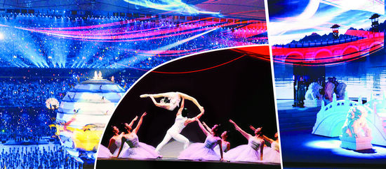 从左至右为2008年北京奥运会开幕式现场、杂技与舞蹈结合艺术《肩上芭蕾》、音舞诗画《天安门》