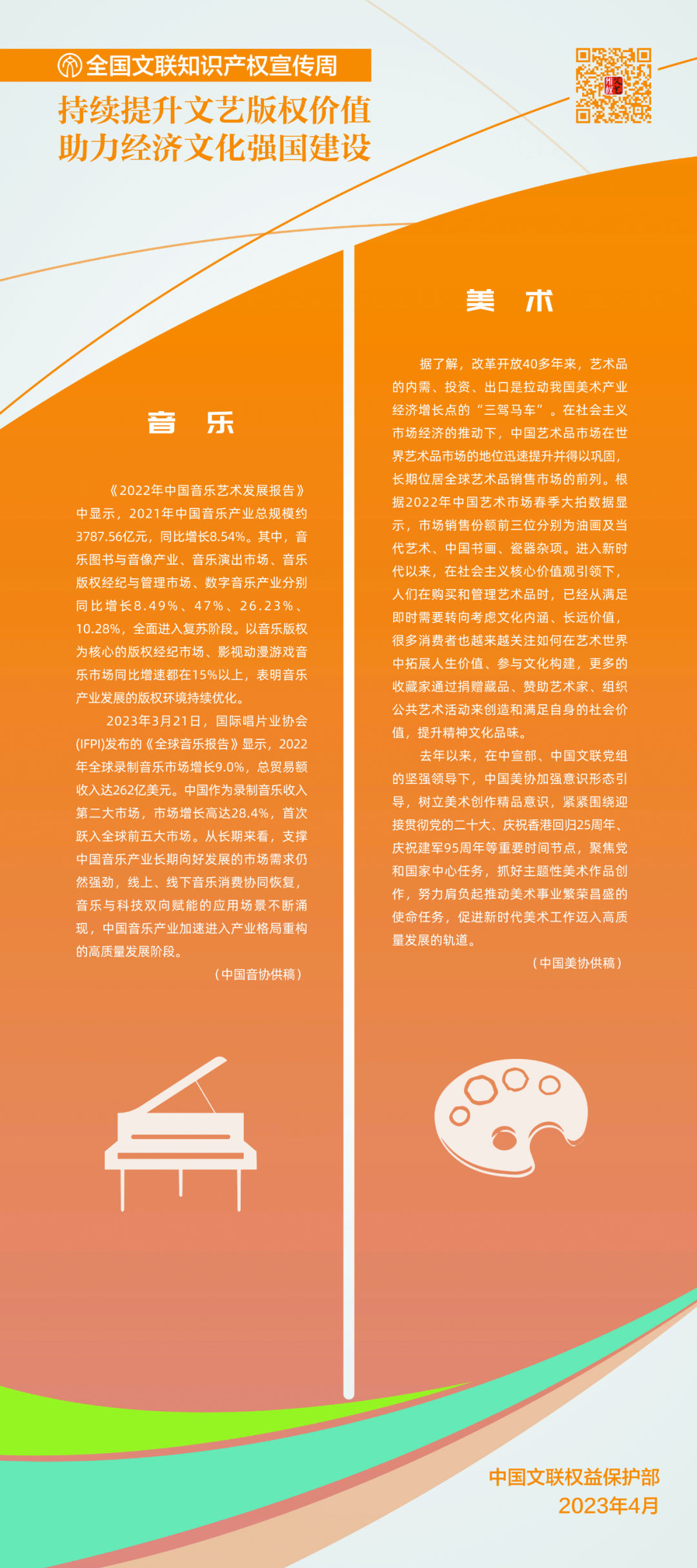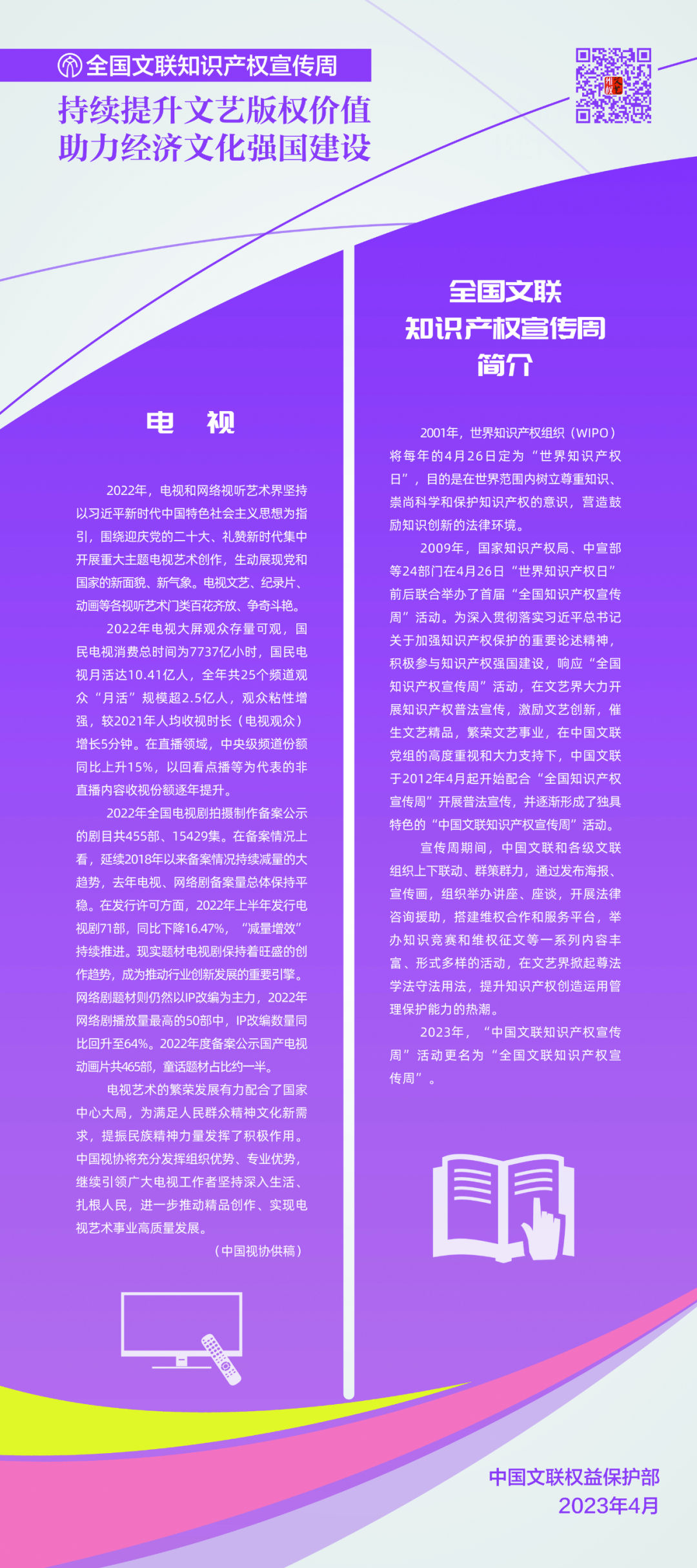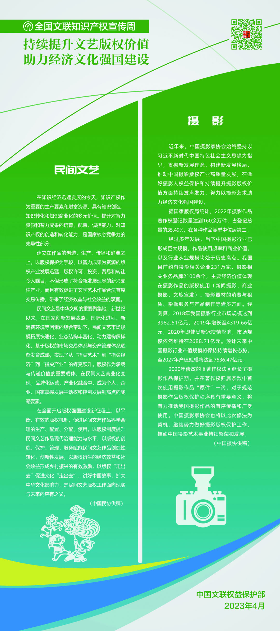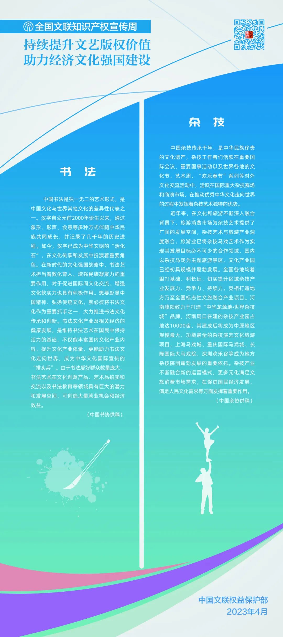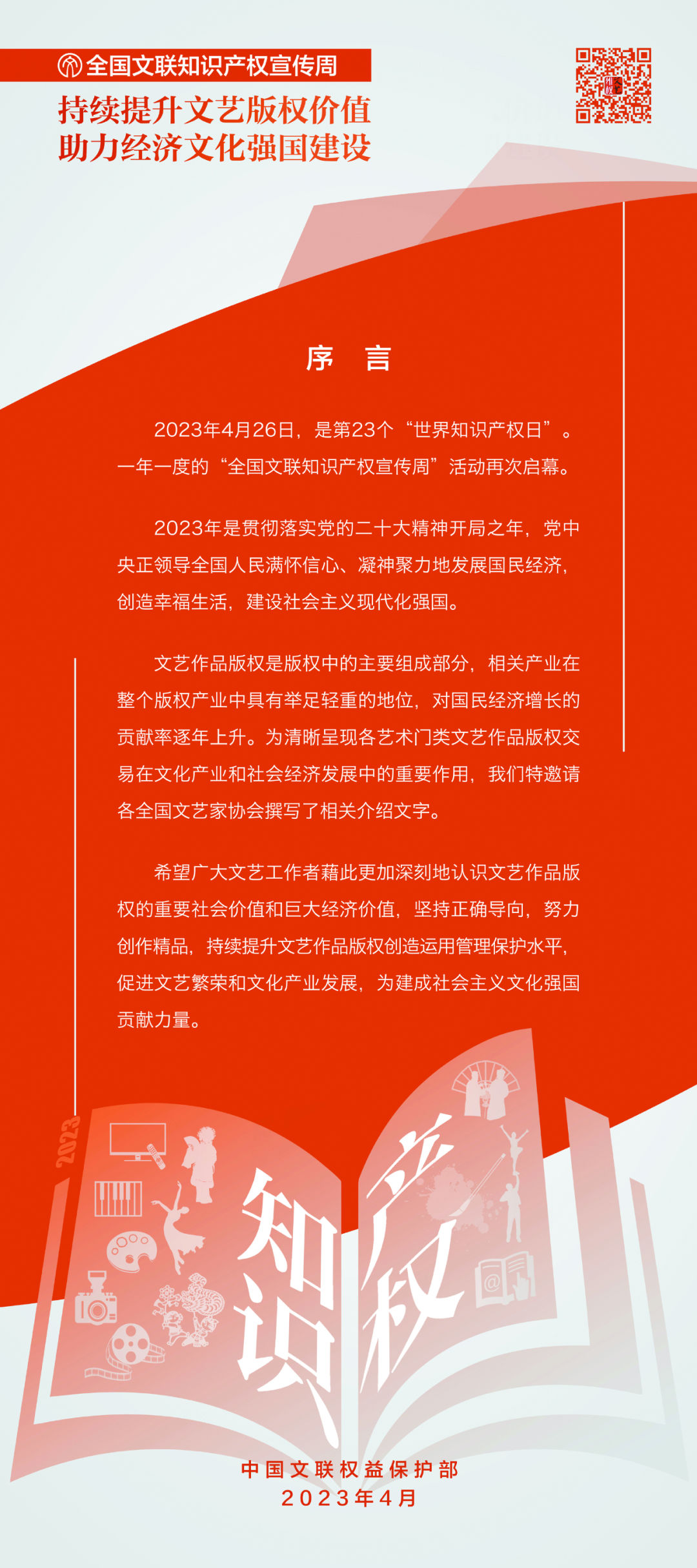 在第23个世界知识产权日来临之际,一年一度的“全国文联知识产权宣传周”活动将于2023年4月24日正式启动。为激励广大文艺工作者多出精品力作,深入发掘文艺作品版权的经济社会价值,助力经济、文化强国建设,本年度“全国文联知识产权宣传周”活动的主题定为“持续提升文艺版权价值 助力经济文化强国建设”。kaiyun电子