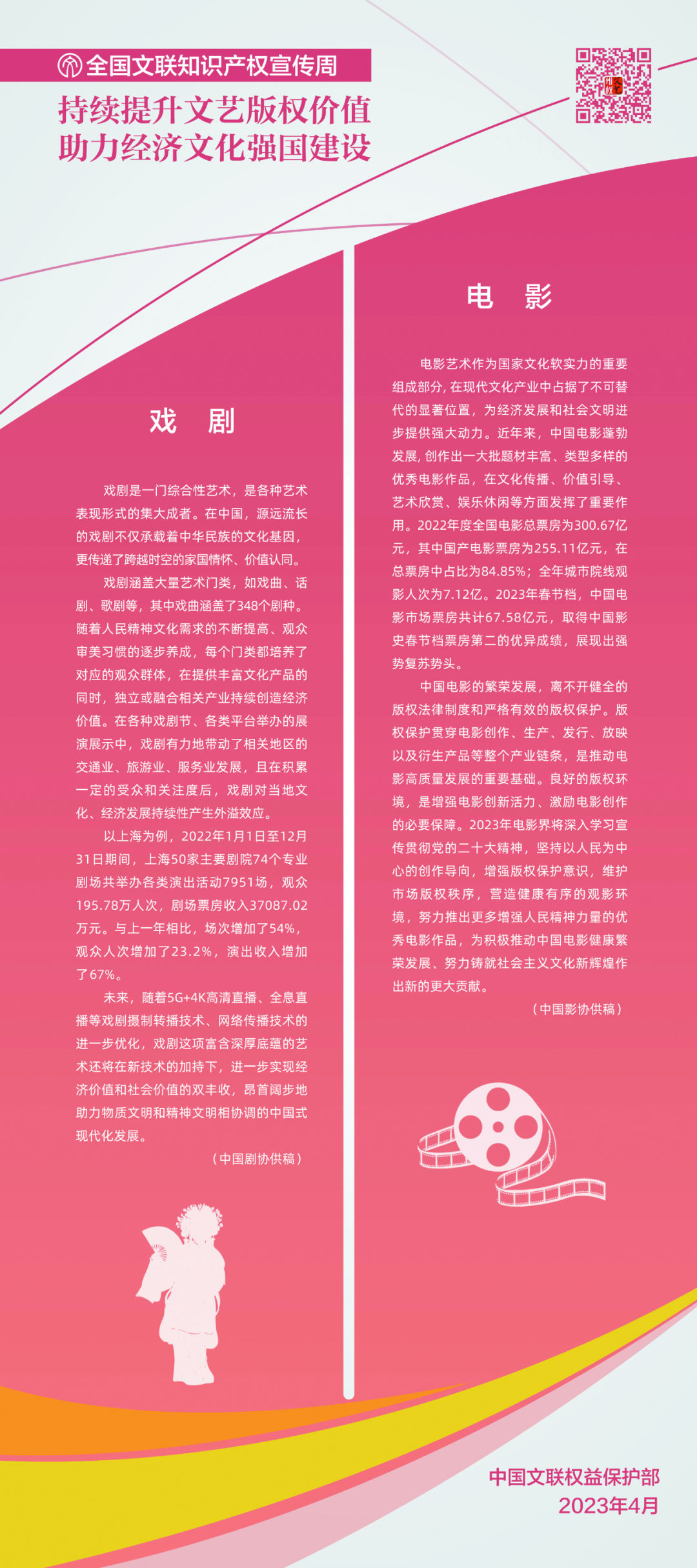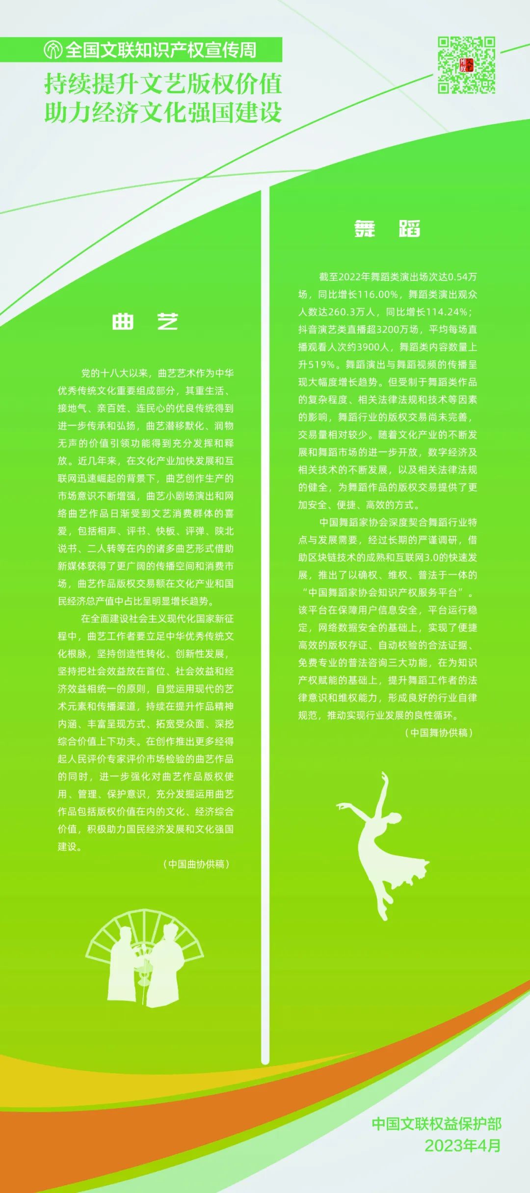 知产周期间,kaiyun电子 将制作“全国文联知识产权宣传周”宣传短片,设计制作主题海报和展板,呈现各艺术门类文艺作品版权交易在文化产业和社会经济发展中的重要作用;举办题为“加强版权运营管理保护 持续提升文艺版权价值”的普法讲座,指导文艺工作者和文联干部提升文艺作品版权创作运用保护管理能力;组织举办全国文联知识产权宣传周暨中国书房文化项目启动仪式,发挥专业优势为新文艺组织传承弘扬中华优秀传统文化提供保护知识产权法律服务;开展著作权法律知识答题活动,引导广大文艺工作者和文联干部重温新修订的著作权法,提高学法用法积极性,更好地维护自身合法权益;继续开展“我身边的知识产权保护故事”征文活动,用文艺工作者的亲身维权经历激励和启发其他同行积极维护自身合法权益。kaiyun电子 各团体会员也将积极响应、踊跃参与,组织具有本艺术门类和本地域文化特色的普法宣传活动。