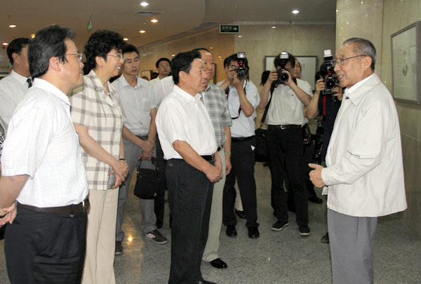 在“素描大师——李岚清素描作品展”现场,李岚清向孙家正等来宾介绍作品的创作过程。中国艺术报 向云驹 摄