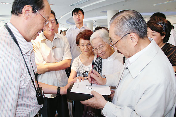 展览的主人,原中共中央政治局常委、原国务院副总理李岚清,白衣灰裤黑皮鞋,他一来到展览现场,就受到观众的热烈欢迎。