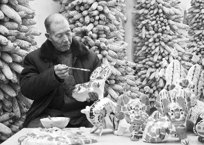 和胡永兴相比,胡深另一位徒弟、侄子胡新明则能闯敢干,在凤翔泥塑的产业化开发上下了许多功夫,早早地就走在了胡深和胡永兴的前面。前些年,胡新明自筹资金申请注册了“胡新明泥塑”商标,并建立了自己的网站,成立了新明民俗文化传播公司。论凤翔泥塑的销售收入,胡新明比胡深父子要可观。当然,胡新明在凤翔泥塑的生产技术革新方面也有自己的贡献。1988年前,六营村的泥塑也曾多次出口,但当泥塑产品运到西安时,已有20%的破损率,运到国外后甚至是100%破损,因此没了回头客。鉴于此,善于钻研的胡新明开始对凤翔泥塑进行技术革新,经过多次实验后,他在泥中加入糯米,将先前制作原料之一的麻纸换成了棉花,不但降低了成本,也成就了凤翔泥塑“摔不烂”的美名。“摔不烂”泥塑研制成功后,凤翔泥塑的销售有了很大起色。