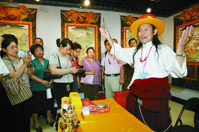 弓箭技艺传承人向外国游客展示技艺。 陈 曦 摄