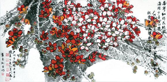 近日,广州市海珠区一百多所中小学的团员、少先队员代表,与画家董应钊一起,共同创作了“南粤红棉花绽放,海珠少年心向党”画卷,向党的十八大献上羊城少年的心意。据了解,在该画卷中,红棉树上的花朵是由中小学团组织和队组织的印章拓印而成。中国艺术报记者 孟祥宁 摄
