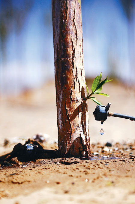 图为青海省海西蒙古族藏族自治州格尔木市林业局护林员利用滴灌设备为格尔木市东郊的一片防风林进行滴灌。