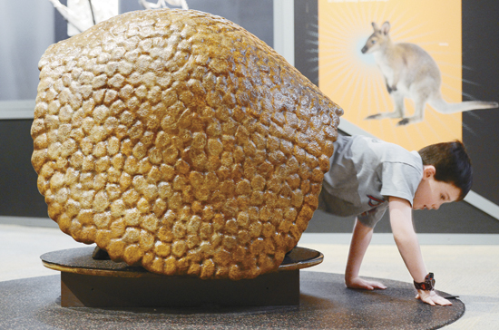 近日,在美国佐治亚州亚特兰大弗恩班克自然历史博物馆举行的“远古哺乳动物展”中,7岁的戴维斯从一只雕齿兽(现代犰狳近亲)的甲壳模型中爬出来。展览将持续到8月18日。