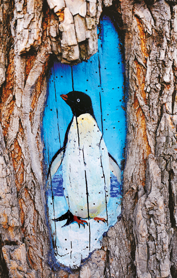 近日,走红于网络的“树洞女孩”王月带着11位热心环保公益事业的“扮美志愿者”在大连市西岗区正仁街两旁的树上进行创作。据悉,王月寒假过后就带领同学们在学校附近的居民区中墙壁上进行创作。她梦想能带领更多的绘画者,画遍大连的街区、角落,希望有更多的“扮美志愿者”加入到“扮美大连”的队伍中。图为王月公益团队里的一位绘画者在一棵大树的树洞上绘画的企鹅。