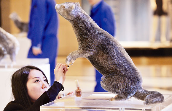 3月28日,沈阳市一购物中心举办“一件皮草 千针万痛”的行为艺术展览,共展出了《兔子》、《狐狸》、《貂》等12个作品,这些作品是沈阳大学教授解勇和他的36名学生,历时100多天共使用了大约55万根缝衣针创作完成的。栩栩如生的雕塑作品描绘了动物所受到的巨大伤害,这些动物的皮毛被千千万万根缝衣针所代替,表达了动物所承受的苦痛,呼吁人们拒绝皮草,爱护动物,尊重生命。图为解勇的学生在给作品做修饰。