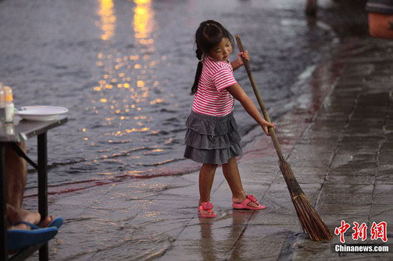 11月12日,洪水进入曼谷城区已有10余天,水势虽缓但仍未退去,就有小女孩开始打扫街边卫生。中新社发 余显伦 摄