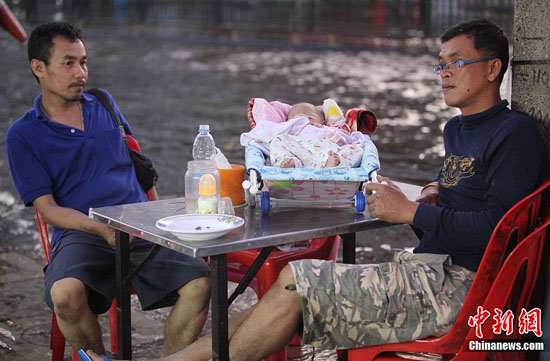 11月12日,洪水进入曼谷城区已有10余天,水势虽缓但仍未退去,有男子带着婴儿在街边小憩。中新社发 余显伦 摄
