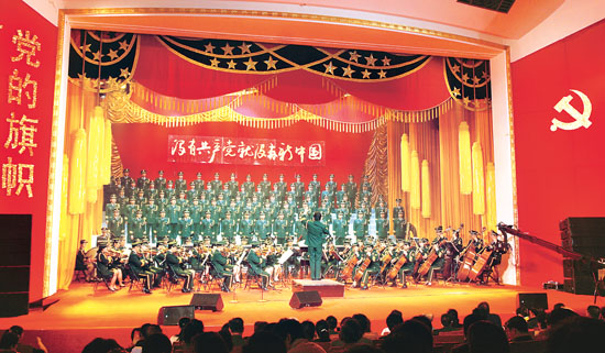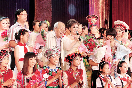 2011年6月,“百花芬芳·党的旗帜高高飘扬——中国文学艺术界庆祝中国共产党成立90周年主题系列演出”在京举行。图为“乔羽演唱会”现场