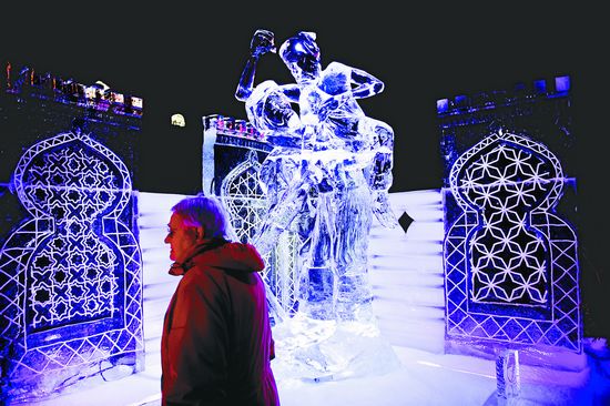 12月15日,游客在荷兰兹沃勒参观冰雕展。国际冰雕展近日在荷兰中部城市兹沃勒拉开帷幕。来自世界各地的40多名艺术家耗费25吨冰和25吨雪,雕刻出一组组栩栩如生的冰雕作品。展览将持续到明年1月底。