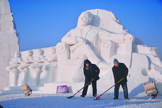 12月24日,牡丹江雪堡靓装迎客,以“欢乐王国·梦幻俄罗斯”为主题的系列雪雕作品吸引了众多游客。图为12月23日,雪雕艺人在牡丹江雪堡里平整地面。新华社发 陈占辉 摄