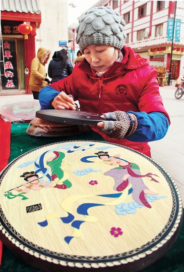 2月24日,在敦煌市街头,美术雕刻师刘桂花在现场雕刻飞天的木板画。当日,在甘肃省敦煌市街头,木板雕刻师在现场作画,吸引游客纷纷前来观摩。这种集艺术创作和旅游产品于一身的木板雕刻工艺品广受海内外游客欢迎。