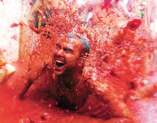 2. 一名男子在西班牙瓦伦西亚附近的布尼奥尔镇的西红柿大战中狂欢。新华社/路透