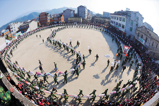 千年古镇竹龙迎元宵。2月1日,浙江仙居下各镇舞动的一条200多节的竹龙盘出八卦图案。新华社发 徐昱 摄
