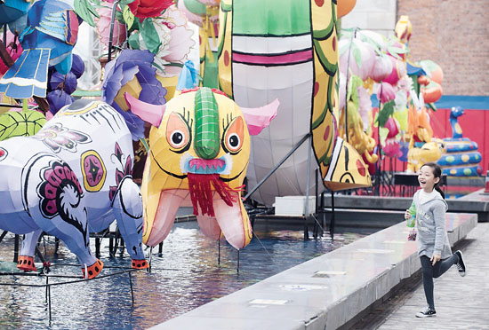 香港举办大型彩灯会共贺元宵节。这是2月2日一位小朋友在香港文化中心外的花灯边玩耍。新华社发 吕小炜 摄