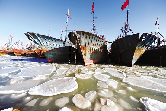 2月8日,商船在山东莱州三山岛渔港避风。 新华社发 初 阳 摄