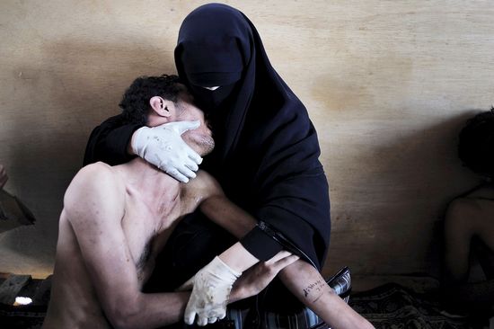 西班牙摄影师塞缪尔·阿兰达在也门首都萨那拍摄的照片“怀抱受伤亲人”获得荷赛年度照片奖。画面中,一名身穿黑色罩袍的女子怀抱一名在武装冲突中受伤的男性亲属,散发着一种宁静的浪漫主义色彩。新华社发