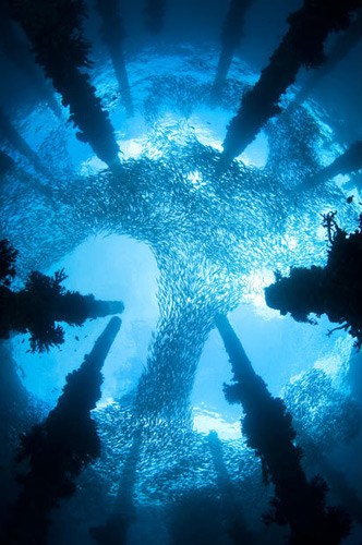 水下世界类冠军:大群竹荚鱼穿行于废弃码头的一根根柱桩之间,形成一幅美丽的图案。摄影师:克里斯-古格。