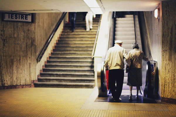环境摄影类青少年组冠军:标志、楼梯、地道、陌生人,一对恩爱的老年夫妻相互搀扶着走向电梯。摄影师:梅列姆-布鲁塞克。