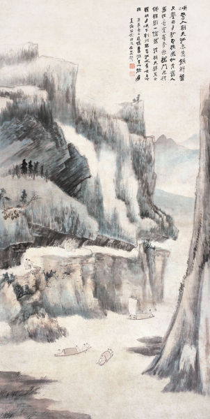 早期的张大千曾遍临古画,对石涛、八大、徐渭以至宋元诸家,皆能得其精髓。这件山水图画于1940 年,是仿古阶段后期的作品,当时画家42岁,正在成都。他追忆自己游览嘉陵江时的情形,将写生与仿古结合起来,描绘了一幅气势激昂的峡江胜景图。