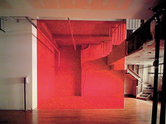 乔治·罗塞是出生在20世纪40年代中期的摄影艺术家,他喜欢自己在空间中设局后进行拍摄。人们被他作品里的错觉所迷惑,某些作品让人进入一个无限的世界,穿透空间里的墙,就会解构这个空间,可以看见一个单独的形象穿透墙体,最后成为无限;另一些作品更为复杂,在墙上涂写各种文字;还有的是把六面墙涂成红色,他说是象征光。