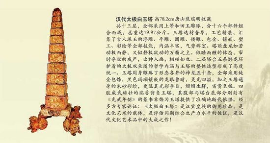 由联合国千年发展目标公益主题活动中国组委会、中国智慧工程研究会、中国收藏家协会玉器收藏委员会评选的“民间十大国宝”在北京饭店宝石厅展出。有新石器时期玉制兔首骨骸、绿松石骷髅头、2395片满工阳刻纹案的周代玉衣、约7万克拉的唐代碧玺猫眼贡珠、汉代黄玉雕鸿门宴、汉代白玉马踏飞燕、清乾隆羊脂白玉桥型笔架、汉代黄玉车马、汉代太极白玉塔、战国青铜鎏金嵌宝石吊壶、清乾隆珐琅彩瓷孔雀等,堪称中国古代艺术品中的极品。