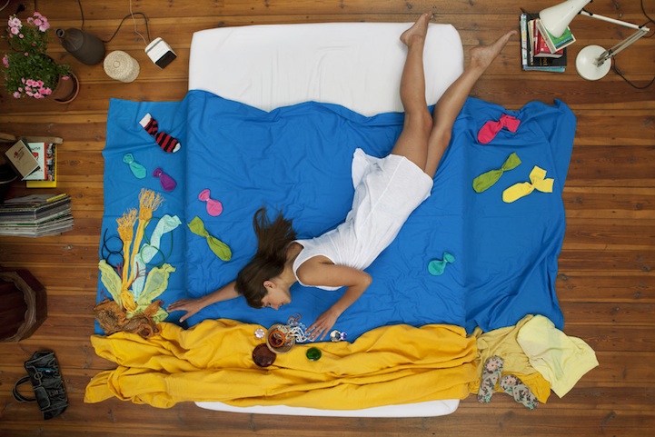 他请来一名普通的美丽女子,作为这组作品中的主角。他用常见的家居用品,比如被子、领带、袜子、唱片等摆放成各种梦境中的形象,再让这名女子躺在床上,摆着在梦境中天真活泼的姿势,然后将这些甜美的梦境用相机记录下来,展示给所有读者。