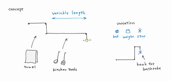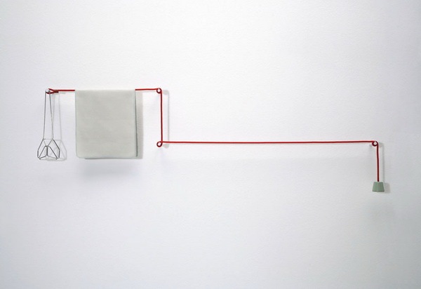 日本设计师hiroomi tahara设计的一款有趣的毛巾架。摒弃以往同类产品固定的框架结构towel hanger更加具有随意性,简单的三部分:绳子、配重、固定杆构成了towel hanger的重要组成部件,你可以根据需要或者心情随意安排和组合它们,在使用上给予了人们极大的想象空间。