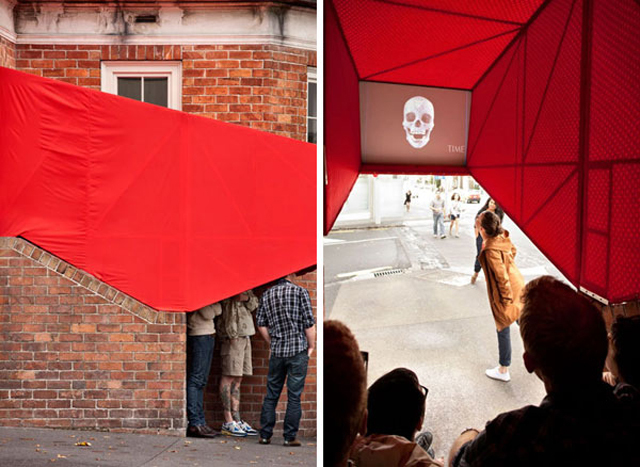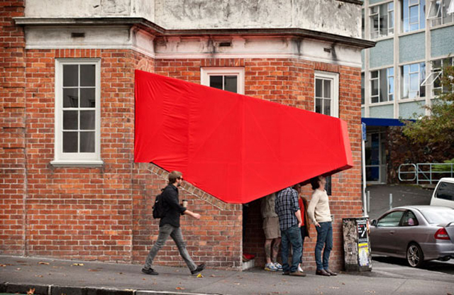 建筑设计团队OH.NO.SUMO在奥克兰的街头设计了一项有趣的公共设备。用一顶醒目的红色顶棚与现有建筑做了个很好的衔接,顶棚里面还可以通过互联网电视观看一些影视短片。这一举动引起了很多市民的关注和围观,这一友好的设计不但可以给候车的路人提供一个歇脚的地方,还能成为三五好友的一个微型聚集地。