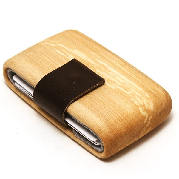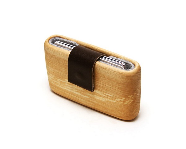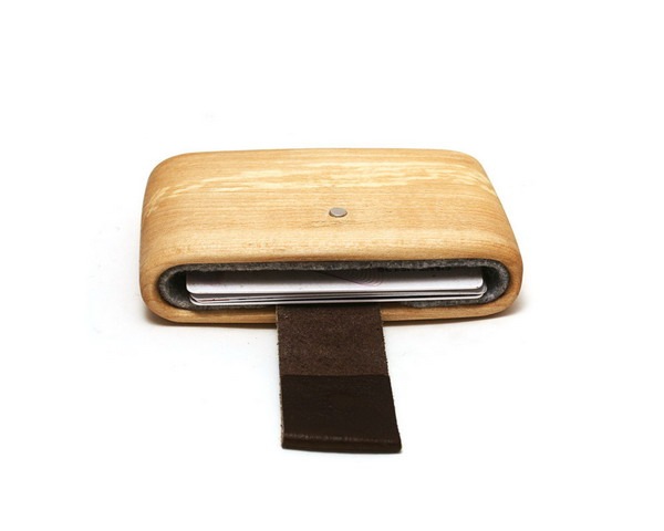 这个别出心裁的木头钱夹采用一整块菩提木手工打磨而成,WOODWALLET的里边衬有一层毡垫应该是为了防滑设计的,因为钱夹里面的信用卡和银行卡一类东西是最容易滑落的,尤其在木质材料上,它的外边用皮带和磁铁将开口部分牢牢封住,试想一下即使这东西不防盗大概也是可以用来防身的吧。