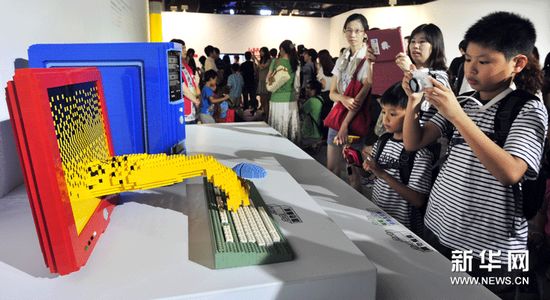 (3)7月14日,参观者在“积木梦工场”欣赏积木艺术作品。