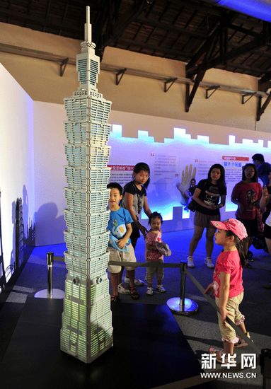 (1)7月14日,参观者在“积木梦工场”欣赏“台北101大楼”积木艺术作品。